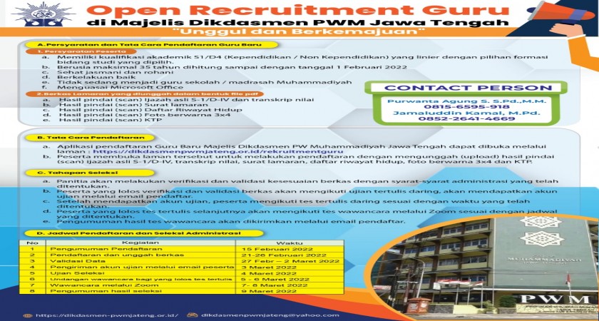 LOWONGAN GURU BARU MAJELIS DIKDASMEN PIMPINAN WILAYAH MUHAMMADIYAH JAWA TENGAH TAHUN 2022