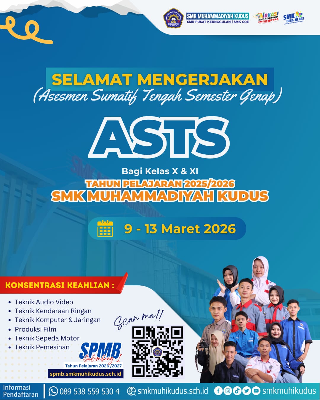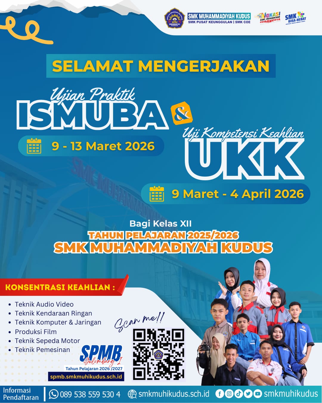 KUDUS – SMK Muhammadiyah Kudus menggelar tiga agenda besar secara serentak mulai Senin (9/3/2026), yakni ASTS Genap berbasis smartphone untuk kelas X-XI, serta Ujian Praktik Ismuba dan UKK bagi kelas XII. Di bawah pengawasan ketat guru, seluruh rangkaian ujian ini mengintegrasikan kecakapan teknologi digital dengan tuntutan kompetensi keahlian industri.